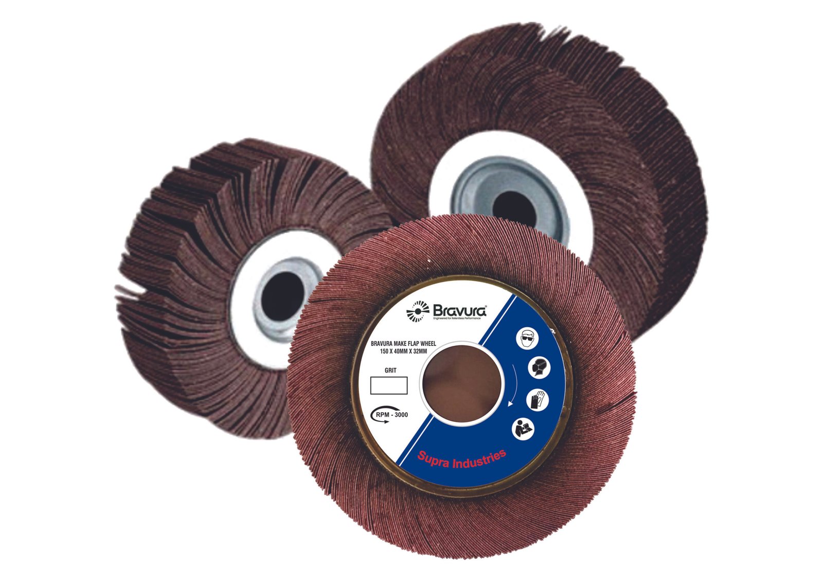 Supra Industries offers BravuraTM Flap wheels are well accepted in the industry for consistent performance and finish generation. BravuraTM Flap Wheels are used grinding or de-burring of metal channels, fillets, recesses, and contours on metal components. Removing parting lines, imperfections, and burrs, De-burring stamping and dies.